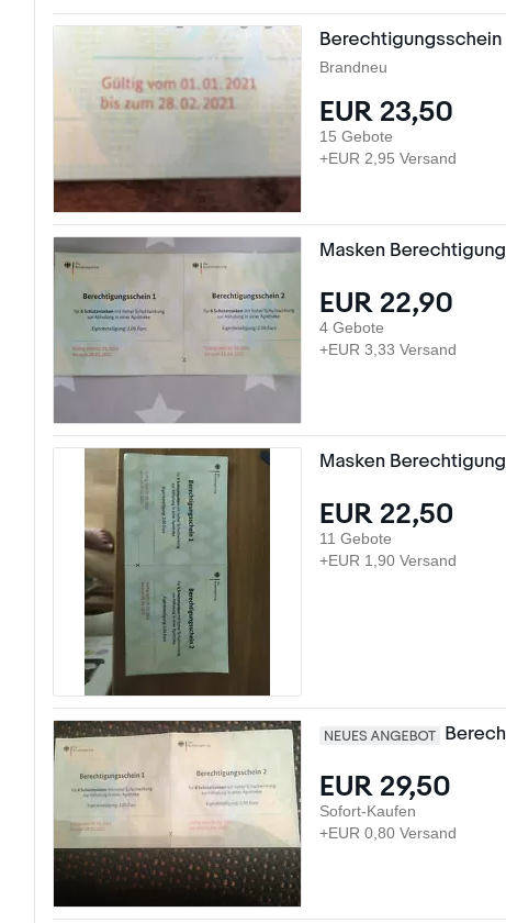The system of entitlement certificates now introduced by the Federal Republic of Germany initially only benefits individual population groups such as certain over 60-year-olds or pregnant women. On the (black) markets, prices are currently emerging that are based on the value of the goods to be purchased. For example, there are already numerous offers of authorization certificates on Ebay.