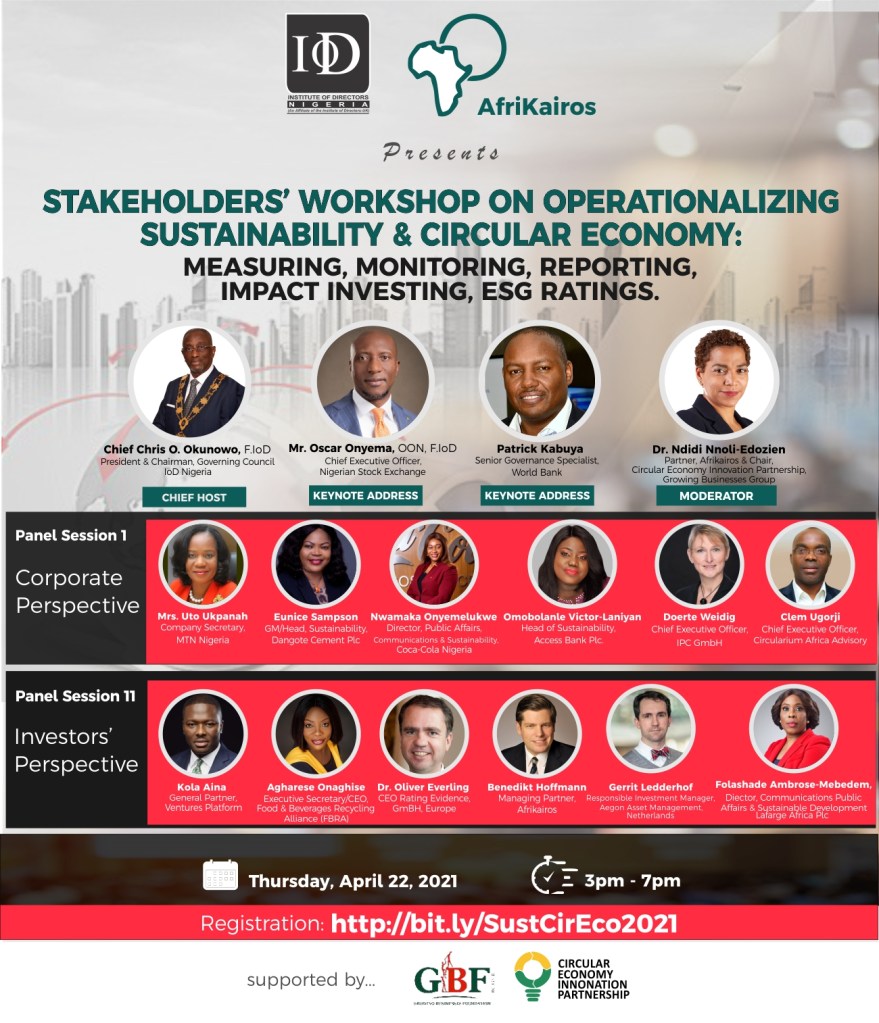 With sustainability becoming more institutionalized as part of the corporate governance best practices, and with the Institute of DIrectors (IoD) Nigeria having a significant role to play to raise awareness and build the capacity of its members and non-members to set high standards for sustainability governance in Nigeria, the Institute has partnered with Afrikairos GmbH, supported by Circular Economy Innovation Partnership (CEIP) and Growing Businesses Foundation (GBF), to bring together corporate Nigeria and relevant regulators in a half-day stakeholder workshop. The aim is to provide insight into levels of adoption, interests as well as capabilities within corporate organizations on sustainability reporting. This webinar introduces a range of perspectives on sustainability , circular economy, ESG Ratings and Integrated Reporting and paves the way for a series of future workshops to be delivered by IoD and Afrikairos in Q3, 2021.