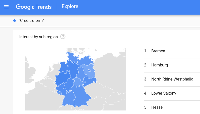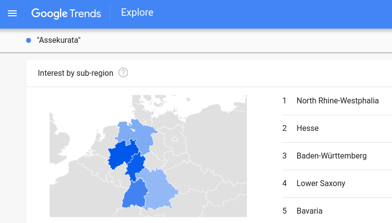 The more German federal states are marked in a shade of blue and the darker the blue, the more inquiries Google was able to record.