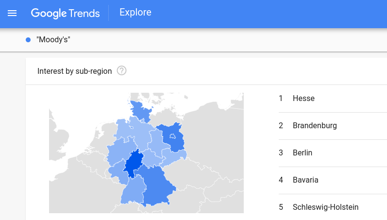 As the figures show, there is keen interest in most rating agencies domiciled in Germany. So these rating agencies are searched again and again: Assekurata, Creditreform, DBRS, and, last not least, Moody’s. It also shows that the important financial centers in Germany are obviously relevant for the number of searches for these agencies. The city of the headquarters of the rating agency also seems to play a role, as does the industry or international orientation.